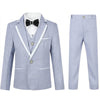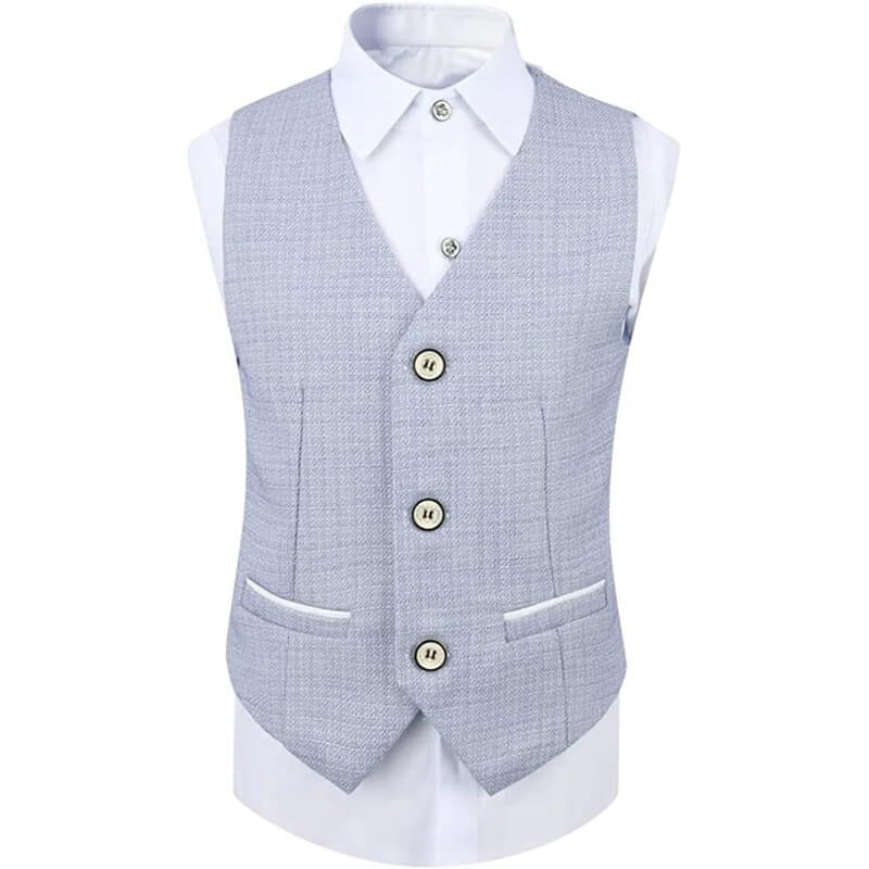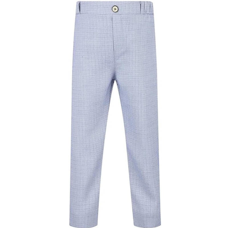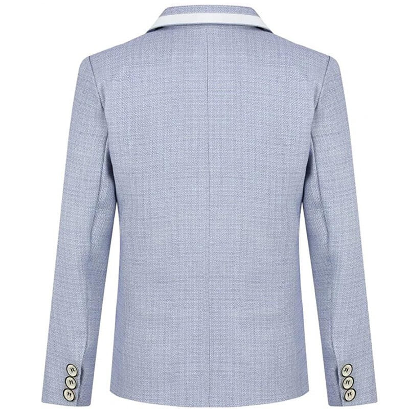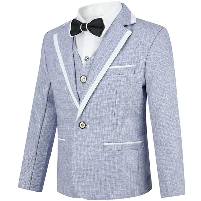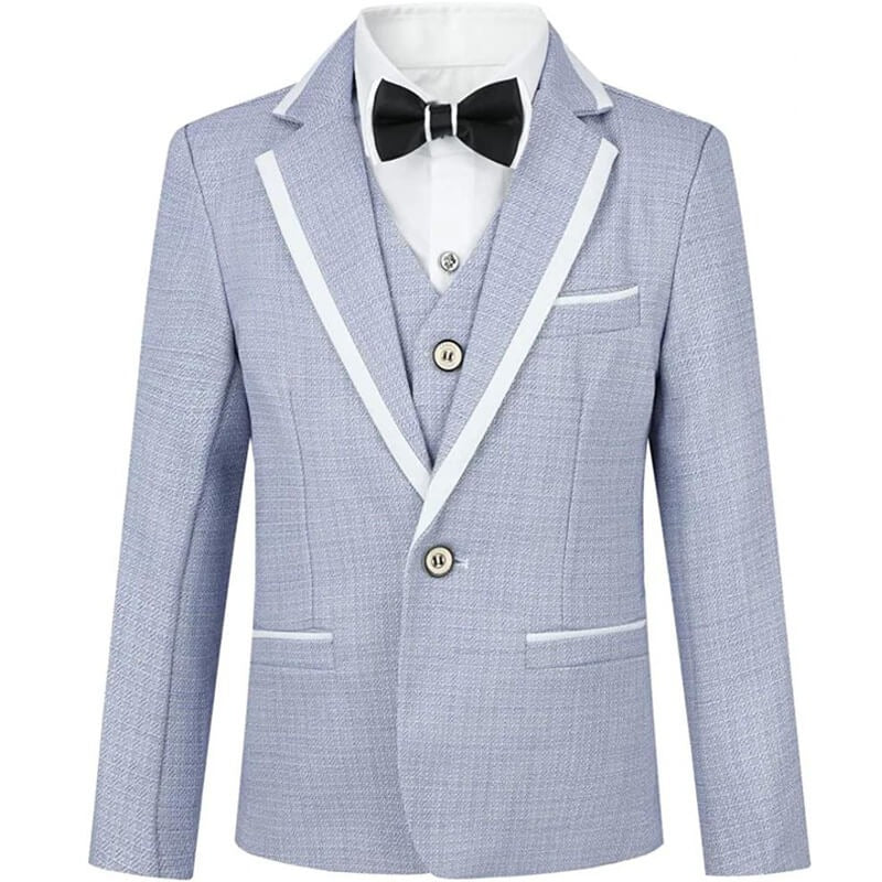 Avec ce costume de cérémonie, tout garçon se distingue par une allure pleine de charme et de confiance. Le tissu bleu clair apporte une note fraîche et moderne. Il est idéal pour les beaux jours avec une conception en tissu noble cérémonieux. Les finitions contrastées blanches donnent du caractère à la veste, le pantalon garde une ligne simple. Le gilet et le nœud papillon complètent l’ensemble avec justesse, pour un look à la fois classique et actuel.
