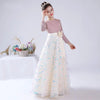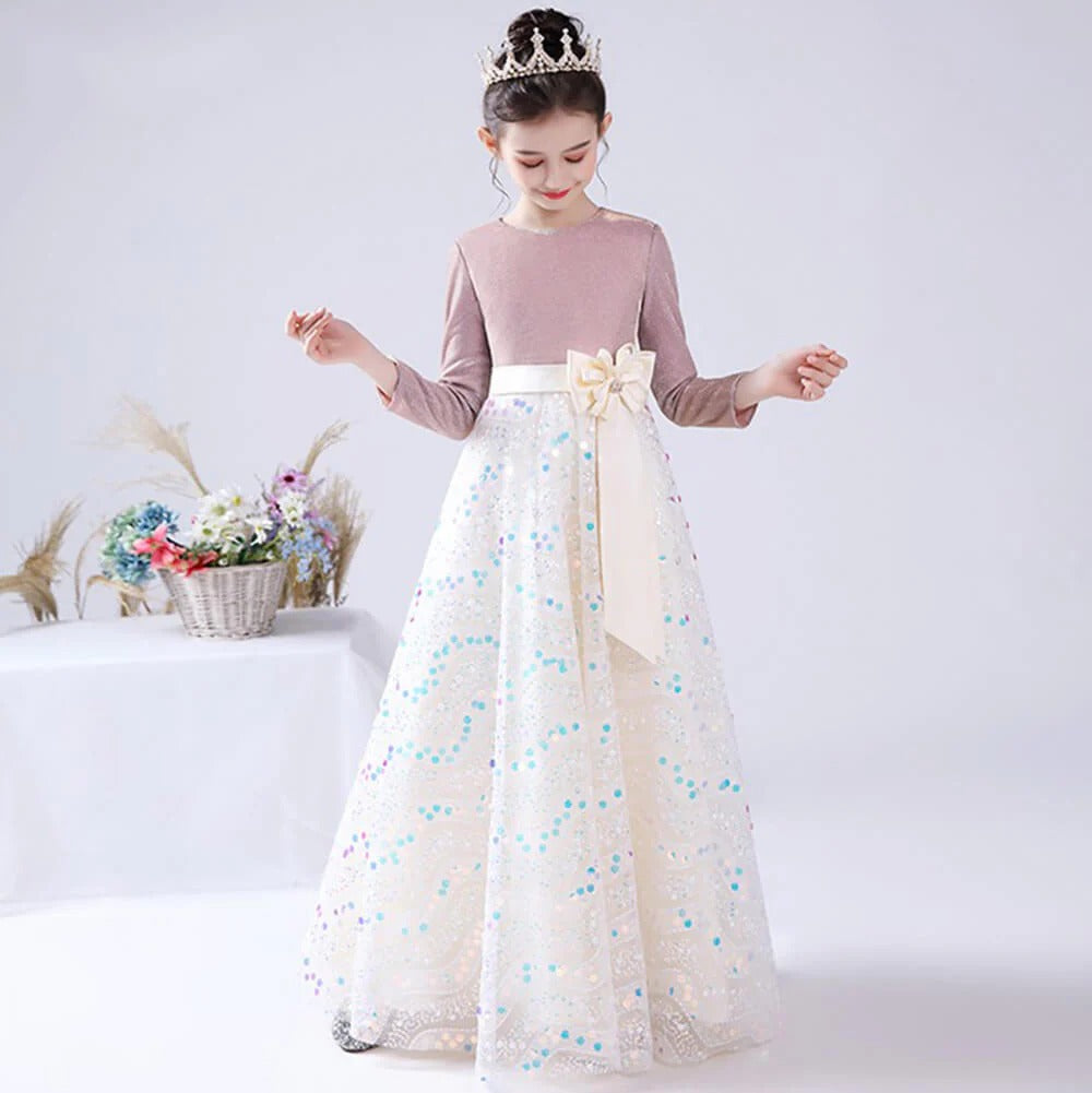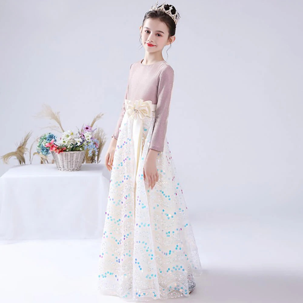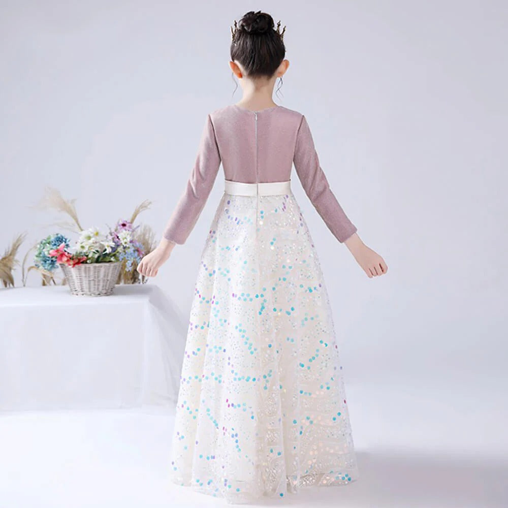 Une robe de cérémonie se distingue par son haut rose poudré aux manches longues et sa jupe décorée de détails scintillants. Le contraste des couleurs lui donne un charme, alors que la coupe droite assure une aisance parfaite pour danser et profiter de la fête. Avec son nœud à la taille et ses finitions travaillées, c’est un choix plein de fraîcheur pour les mariages, les réceptions et autres moments festifs