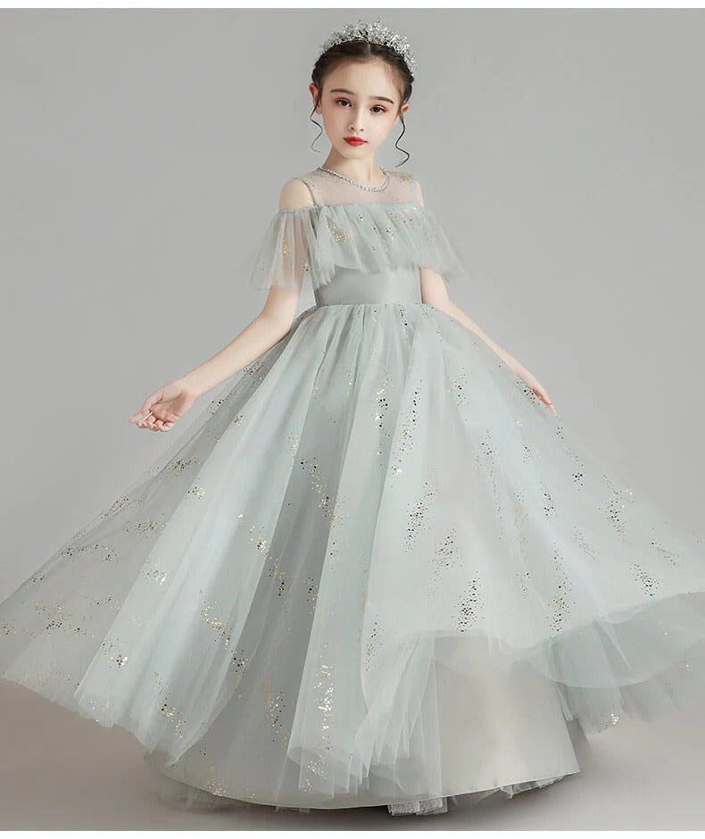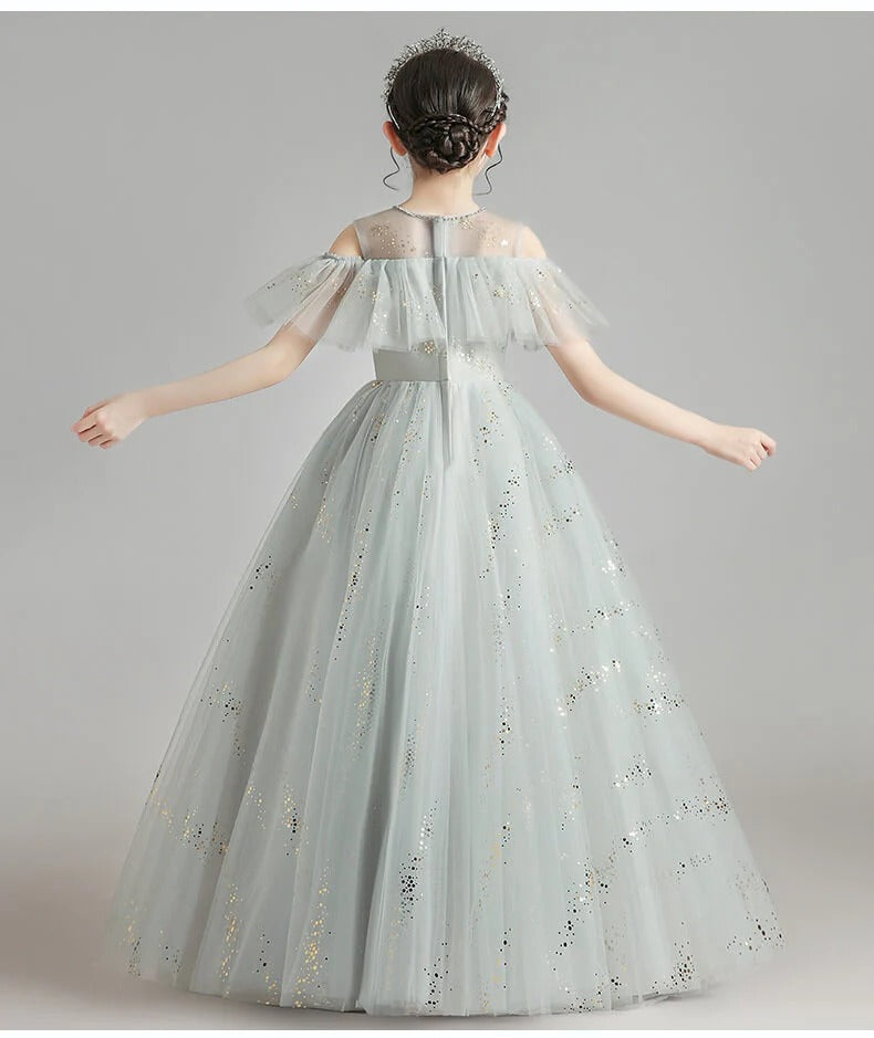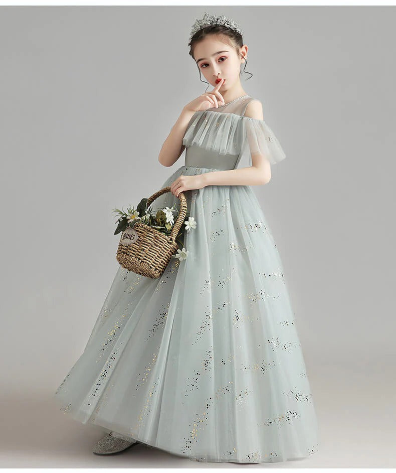 Une robe de rêve pour petite princesse, conçue dans un tulle volant rehaussé de paillettes scintillantes. Son haut doublé avec des épaules dégagées apporte une touche moderne. Parfaite à portée lors d'un mariage, d'une fête ou d'une grande cérémonie, elle fera briller chaque moment.