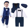 Ce costume classe et élégant ajoute un charme indéniable au petit garçon qui aura le privilège de le porter lors d'une journée spéciale. La tenue comprend un gilet avec nœud papillon assorti, un pantalon à bretelles et une chemise assortie, offrant un look exceptionnel. Il ne vous reste plus qu'à trouver une jolie paire de chaussures Lily et Sacha pour compléter ce costume de cérémonie pour bébé !